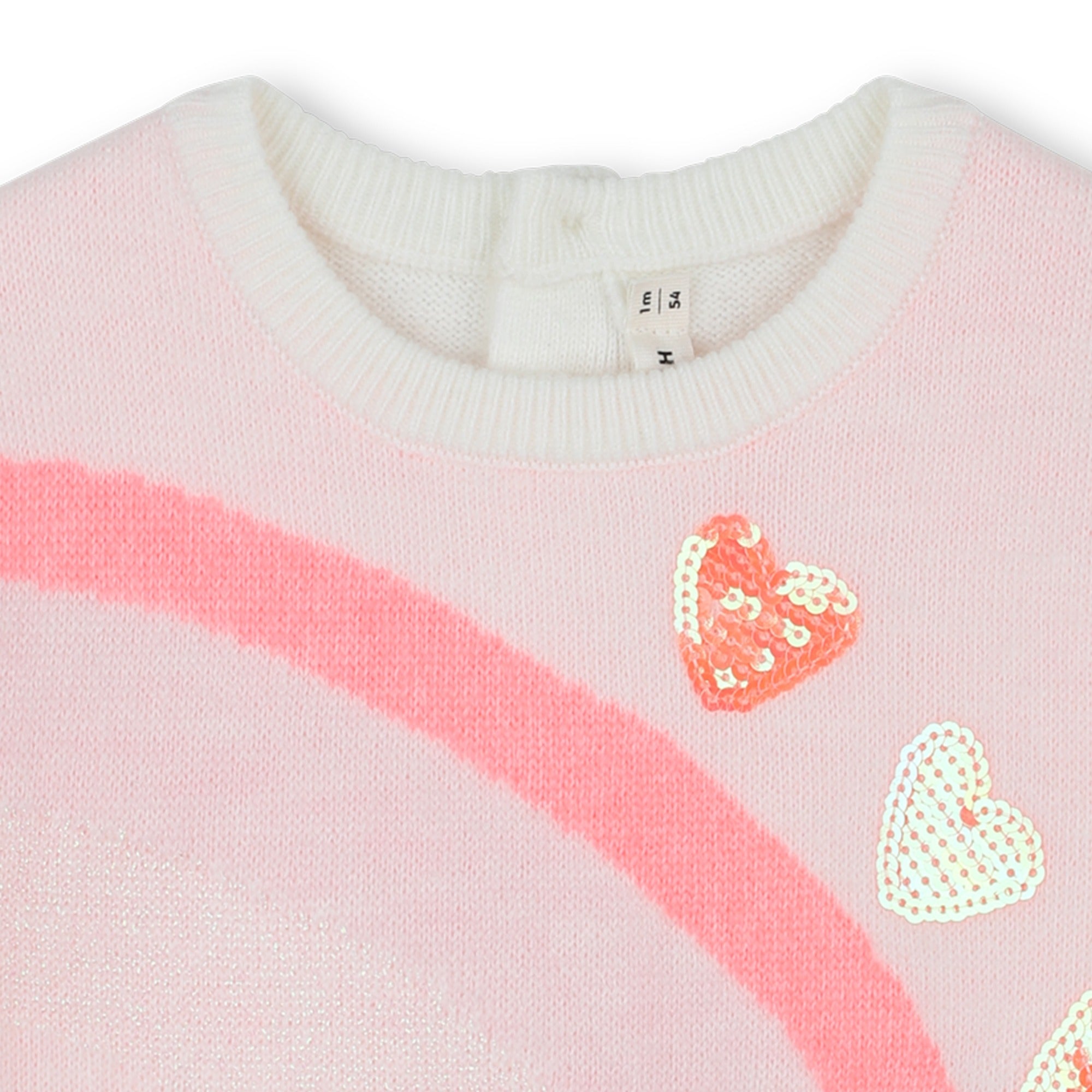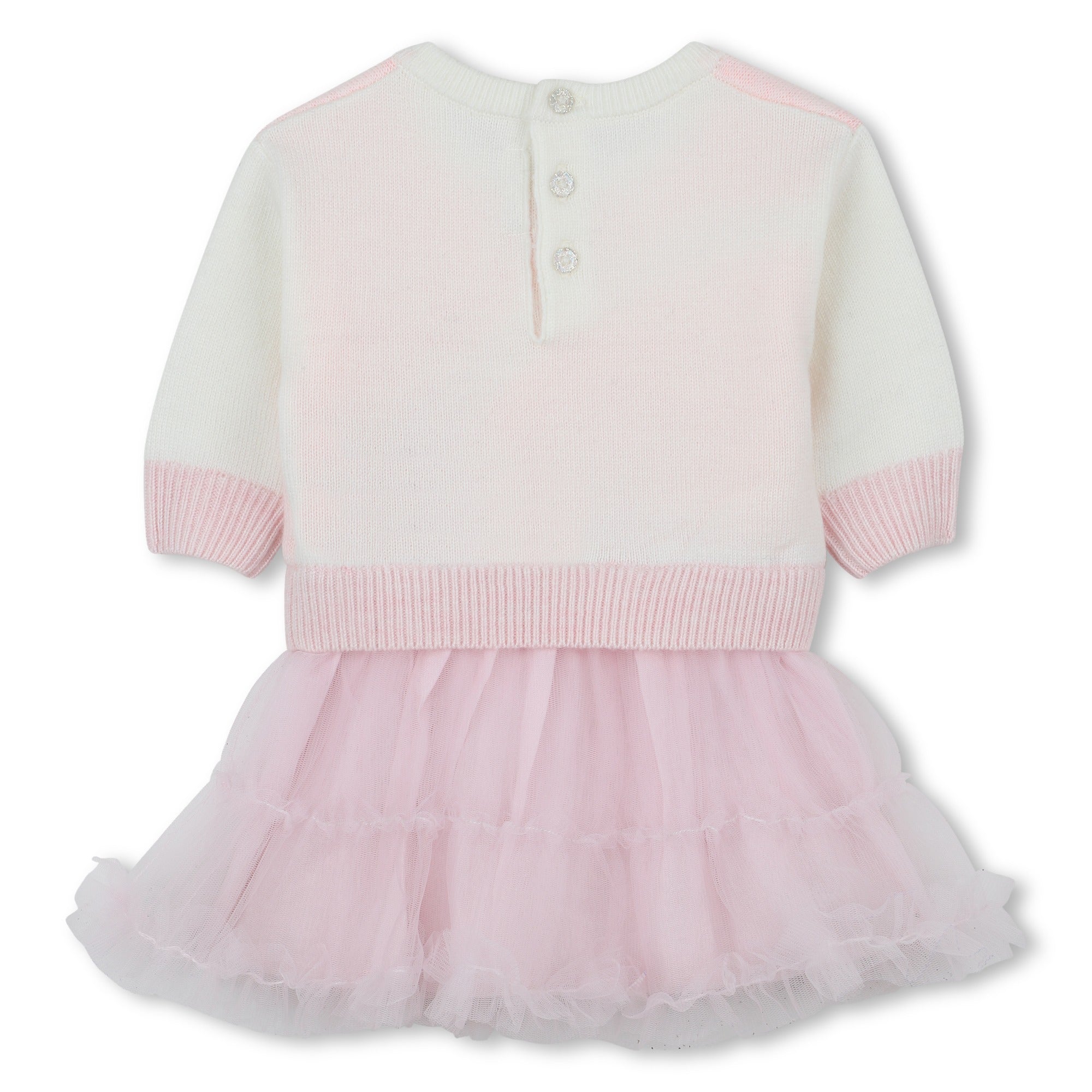 Cute pink dress for baby girls by Billieblush, in a charming layered style with the appearance of a two-piece. The jumper-style bodice is softly knitted, with a rainbow design and shiny pink sequin hearts, and the gathered tulle skirt is prettily ruffled around the hem. The dress fastens with sparkly buttons on the back to complete the look
