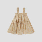 This woven cotton gauze dress has fluttered sleeves, gathering along chest and second tier of the full bodied skirt.