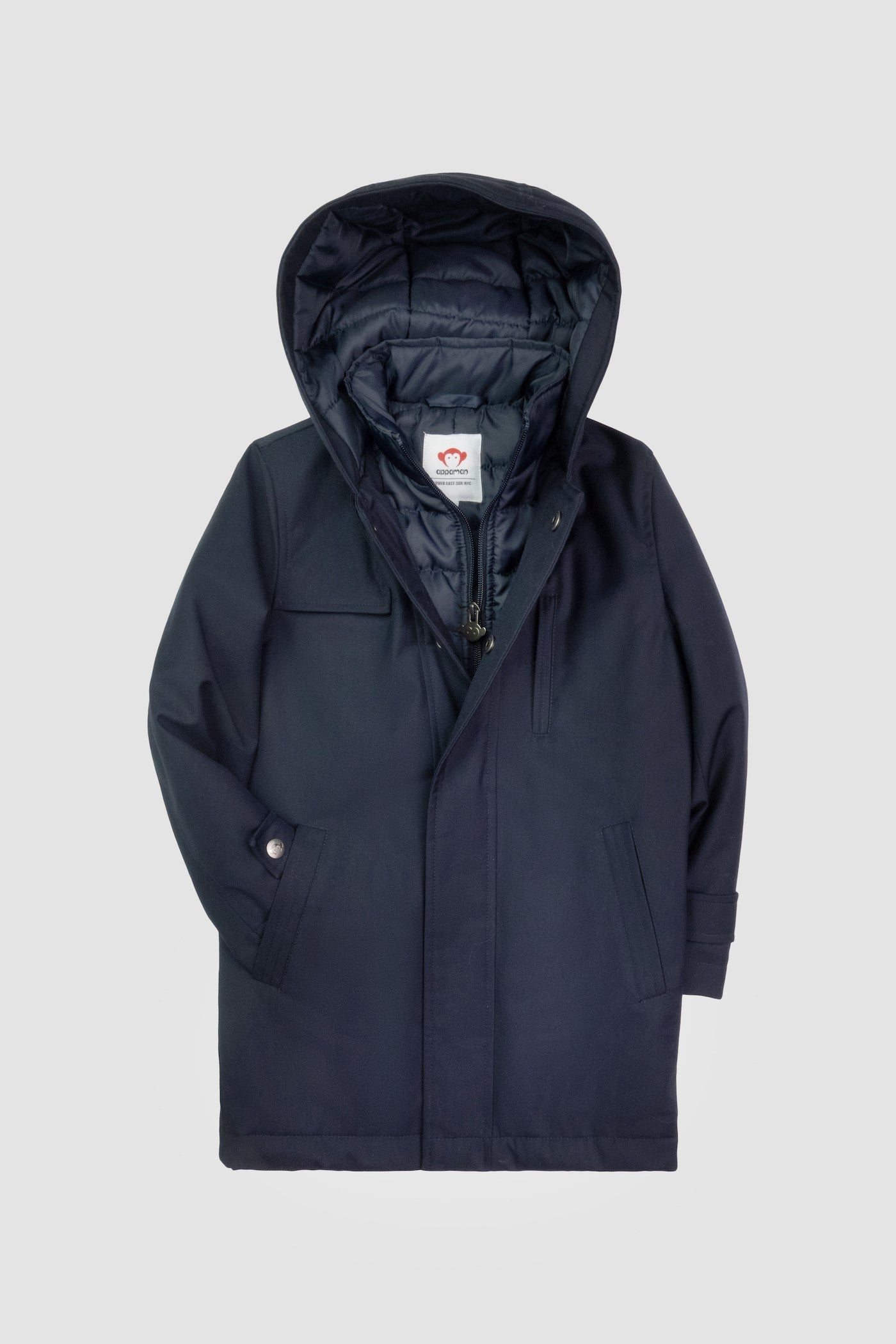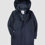 This navy blue coat features a cozy hood, puffer dual layer with a hidden zip, a snap-front placket for extra protection against the cold, and convenient pockets to keep their little hands warm or store small essentials. It combines comfort and practicality with a sleek urban look.