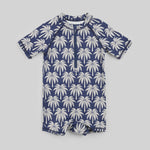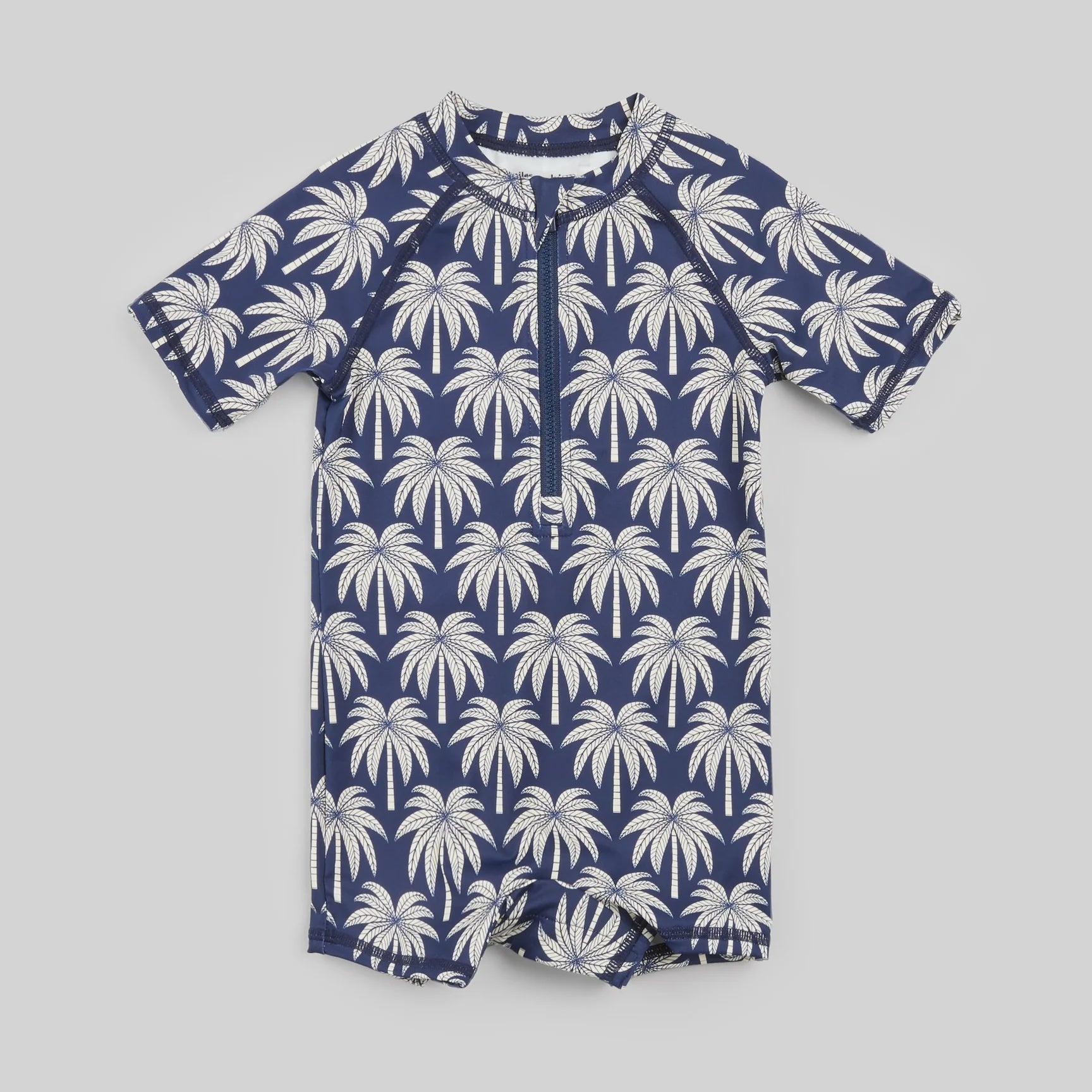 Even if you're just heading to the local pool, this short-sleeved swim romper has all the vacay vibes they need. With an all-over Palm print, it's perfect for feeling summery all year round. The romper is made with recycled materials which are just as kind to the planet as they are on their skin. As an alternative to swim trunks, our swim rompers are a great way to protect their skin from pool chemicals, salty sea and grainy sand. The ½ zip down the front makes the piece easier remove after an exciting day at the beach or a playful swimming lesson. As standard with all our swimwear, the romper has built-in UPF50+ sun protection.