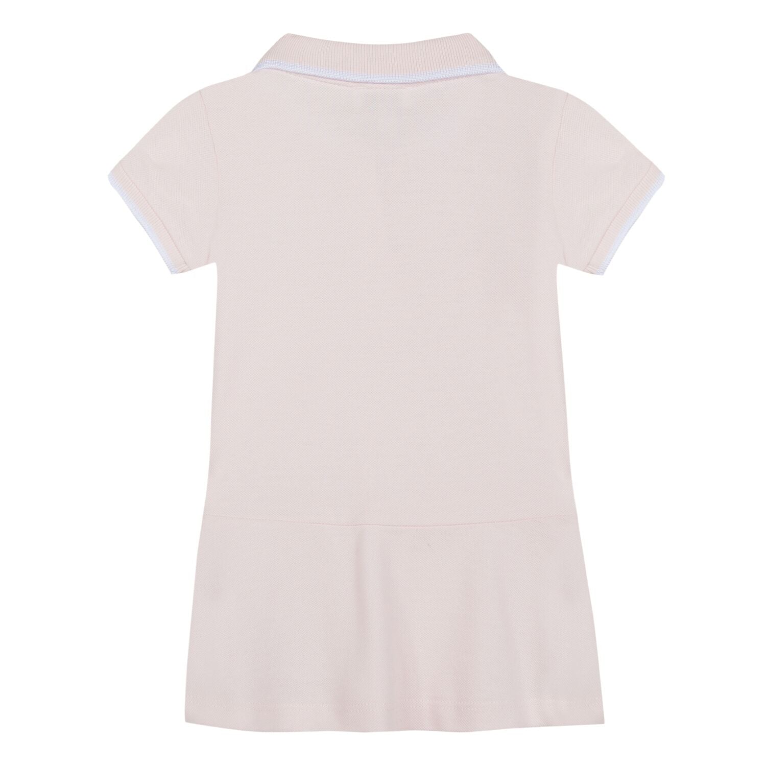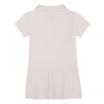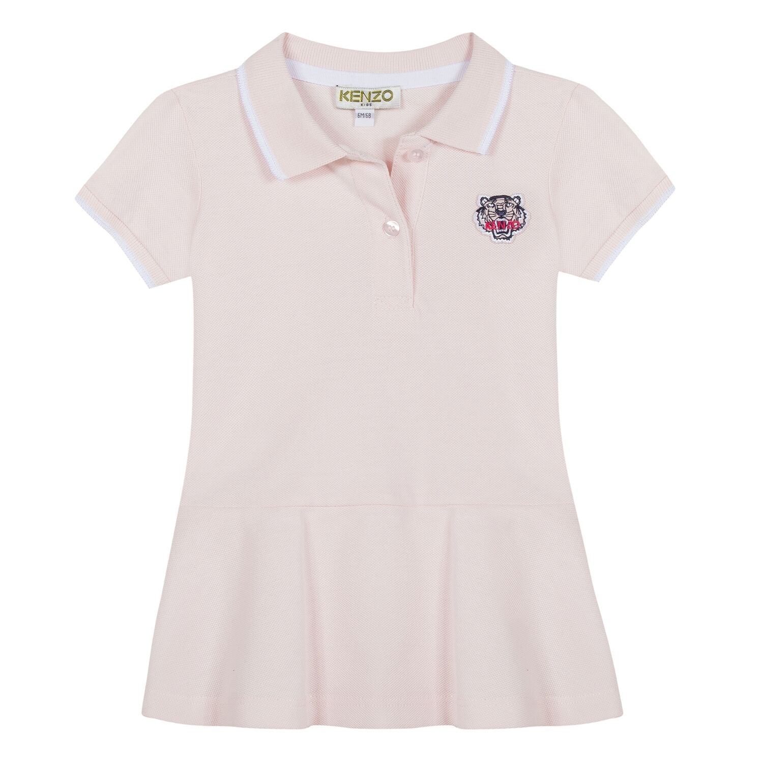 A white polo dress for baby girls by Kenzo Kids, made in soft cotton piqué. It has the iconic Tiger logo on the chest and pink trim on the collar and sleeves.
