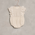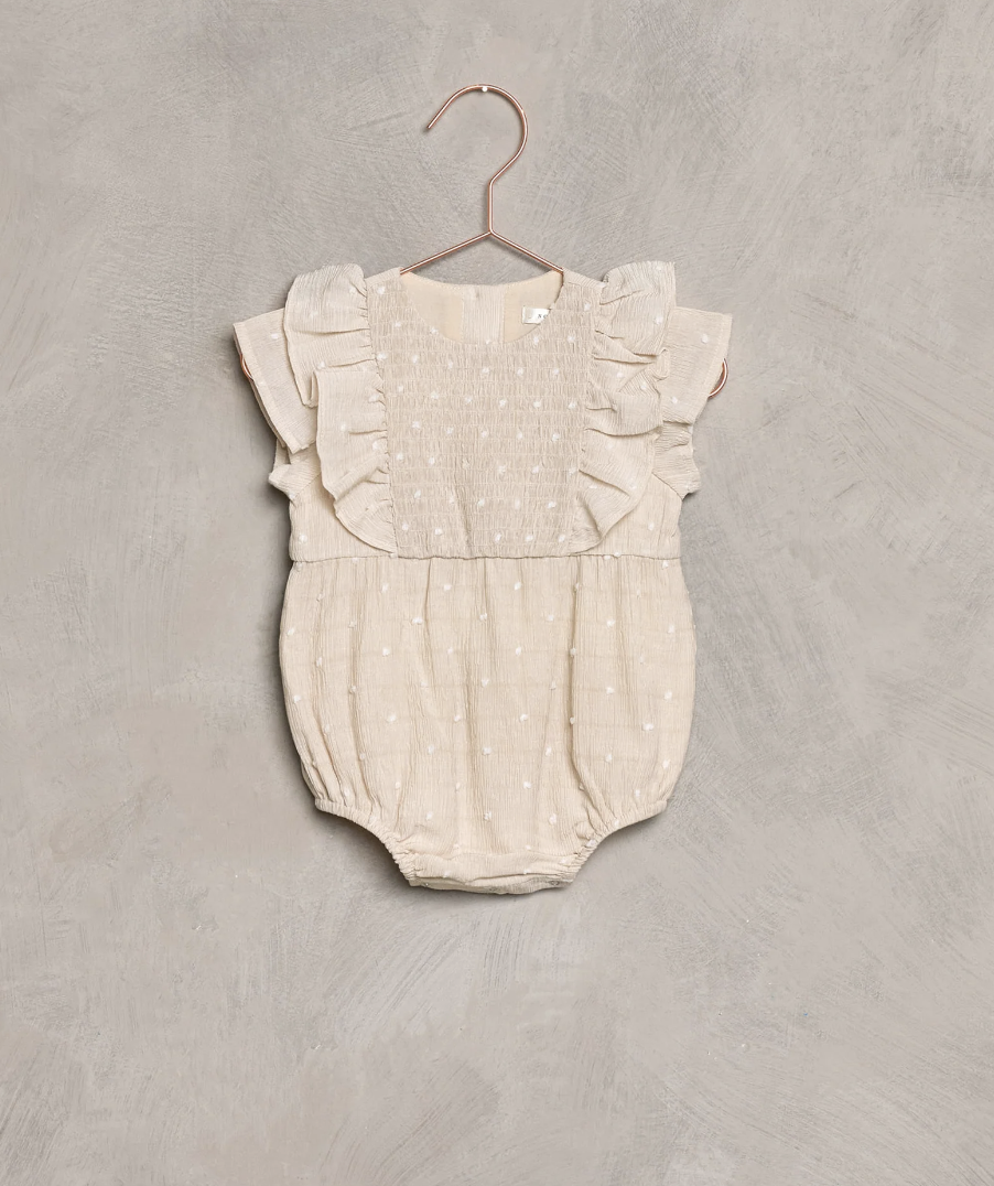 Our 'Blyth' romper has a smocked bodice that’s framed by sweet cap sleeves and ruffle detailing. Button closure down the back and snaps at the crotch for easy changing.