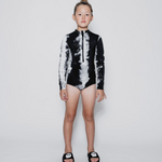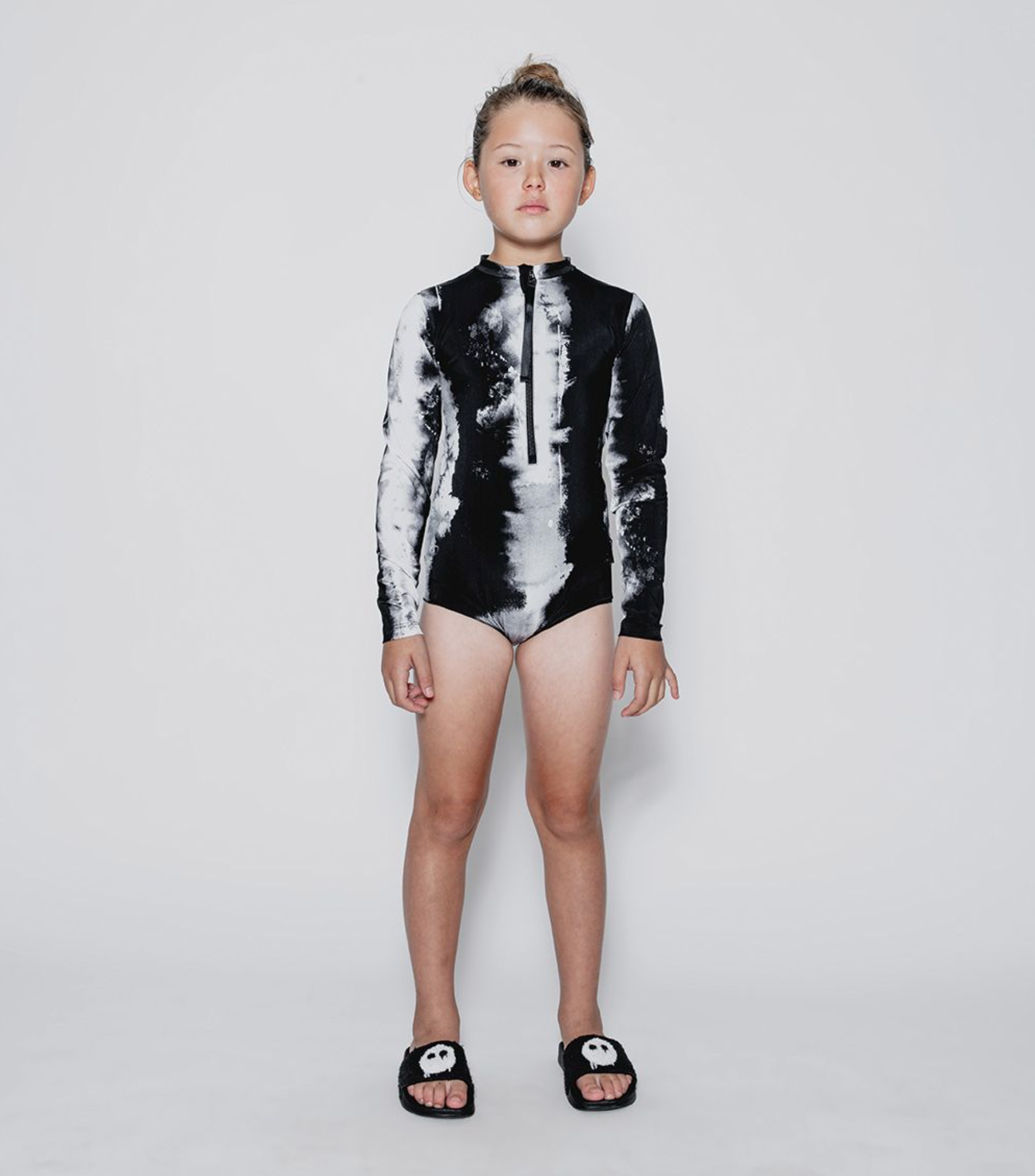 tie dye is all the rage & we can see why. we put our own spin on the hippie fave, making this long sleeved girls’ swimsuit cool & urban with splashes of black & white. long sleeves mean lots of sun protection & they also let the piece double as a top with a skirt or pants, because why not? zips in front for an extra fly feel.