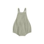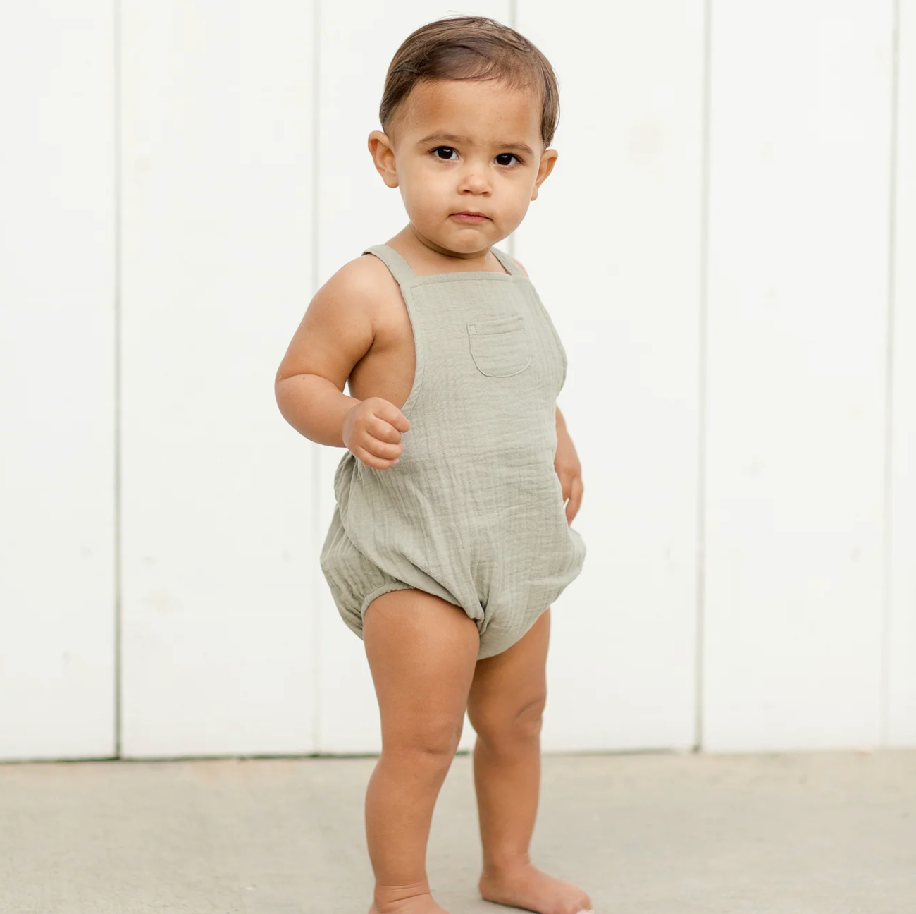 This woven one-piece romper features a criss cross back, a loose bubble shape with buttons at the back, and snaps at the bottom opening for easy changing.
