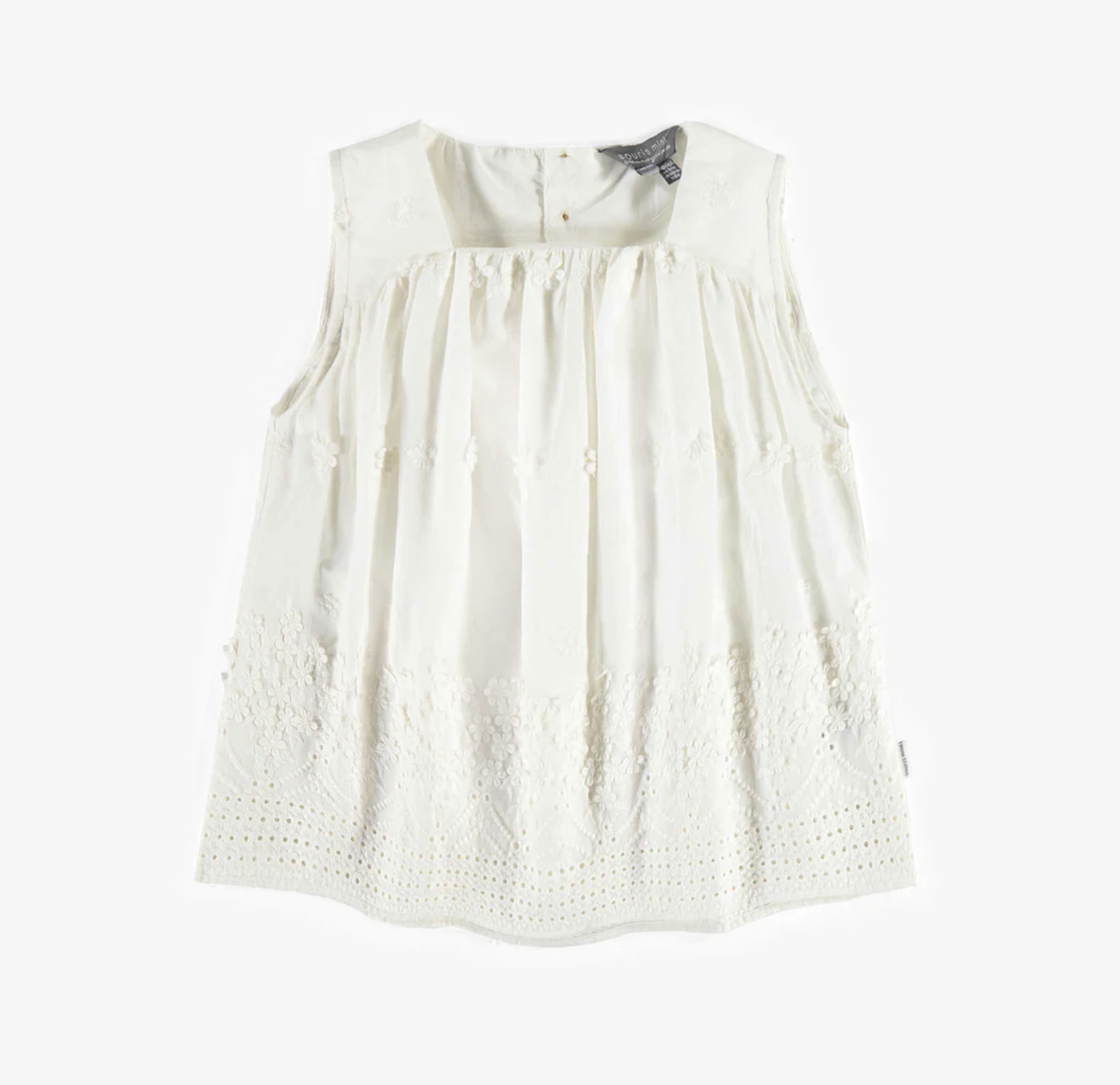 Cream camisole with wide straps with square collar. It is made in a light cotton veil with a play of transparency and adorned with delicate English embroidery. It is dotted with small flowers in relief embroidered by hand which gives a poetic side to this unique piece and demonstrates our attention to detail. Buttons on the back to facilitate the dressing. Its ample cut gives a comfortable effect while remaining in elegance. An item that goes well with our denim pants but is particularly cute combined with matching shorts.