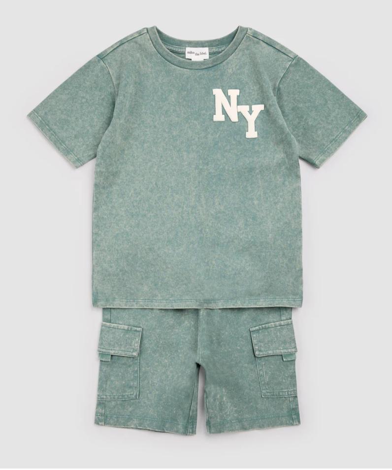 Miles The Label - NYC Puff Print on Green Acid Wash Short Set