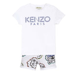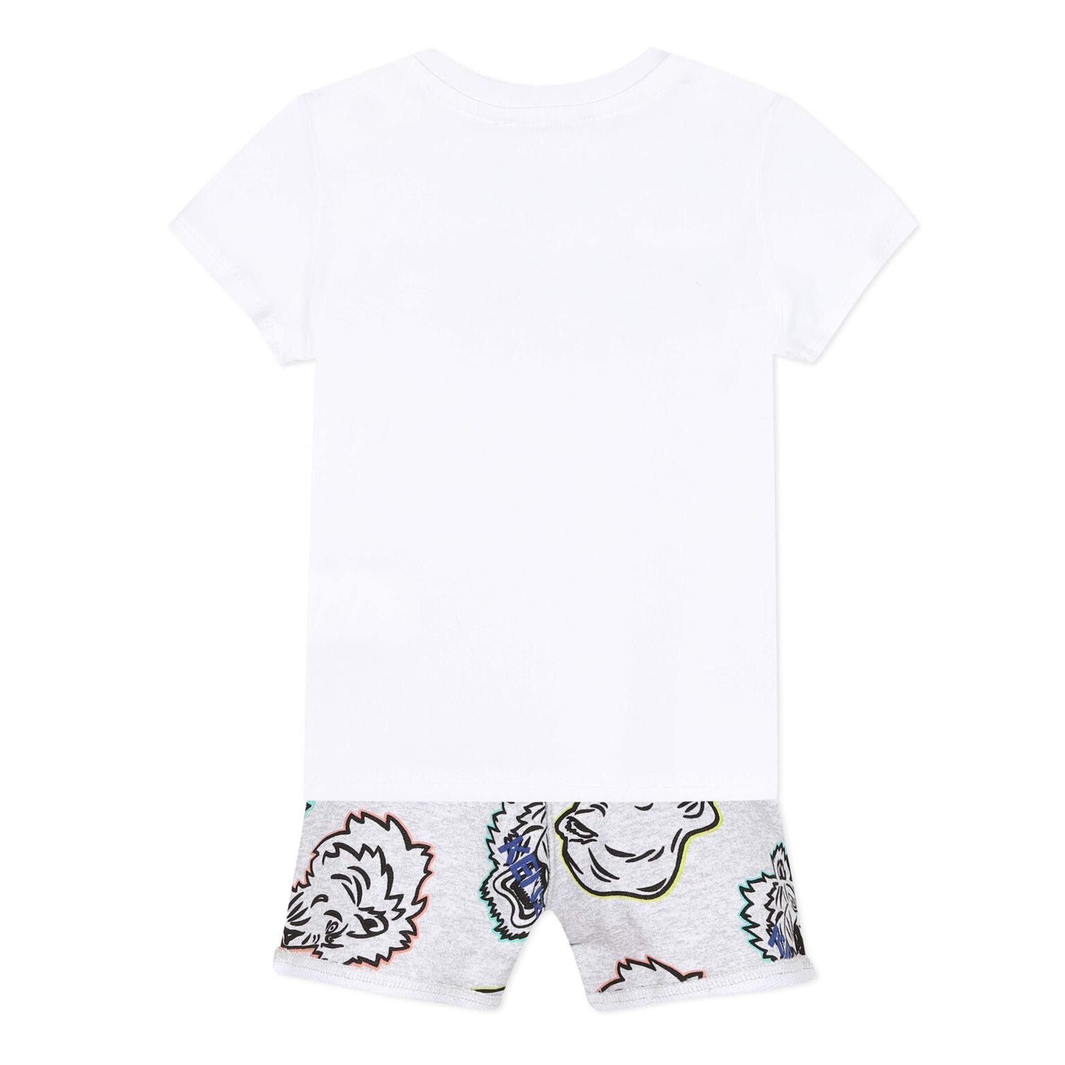 White, grey and blue cotton Jalel logo print tracksuit set from Kenzo Kids featuring a printed logo to the front, a graphic print, a short length, a round neck and short sleeves.