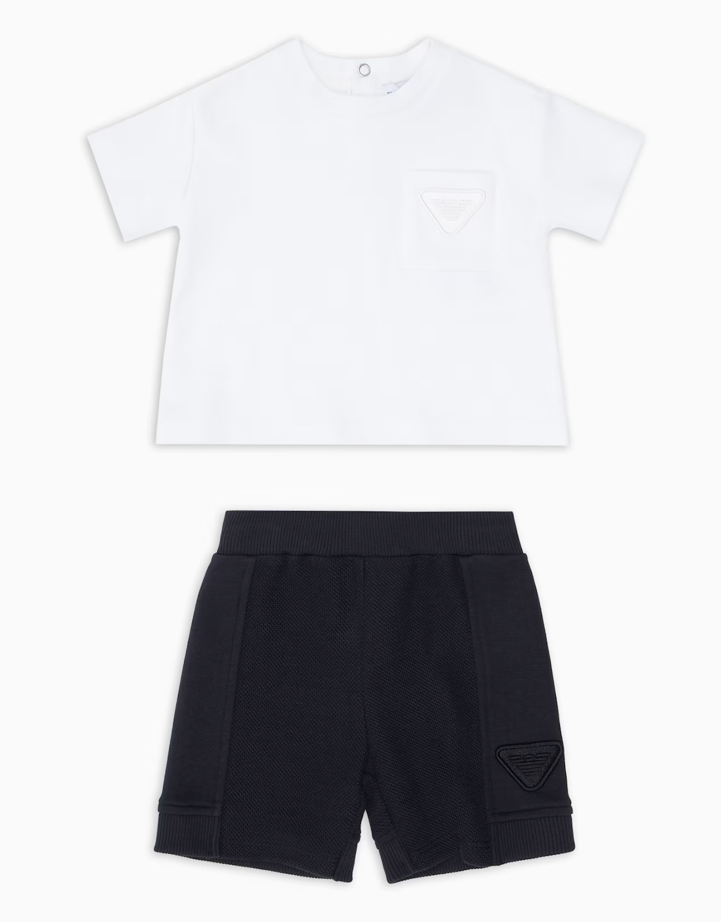 Pure cotton outfit composed of two pieces: Crew-neck T-shirt with press-stud back opening and shorts, both made recognisable by the iconic embroidered eagle logo