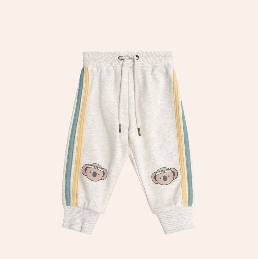 A retro-style pair of terry track pants with a sporty silhouette. Made from fluffy organic cotton, they feature a functional drawstring for an adjustable fit, a soft, stretchy waistband to keep little tummies snug and Kel the koala knee prints.