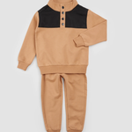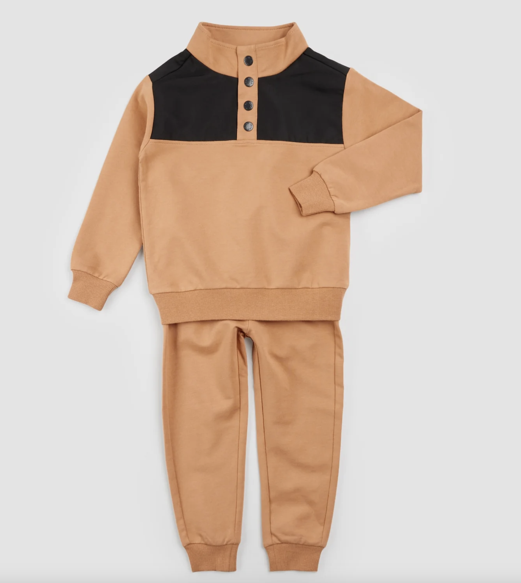 This neutral jogger set is perfect for cozy woodland walks with the family before the hottest seasons arrive. With a French terry top and matching joggers, they’re all set for staying warm on a chilly day. The top has a funnel neckline with buttons to ensure the warmth stays in and the cold stays out. Elastic in the waistband and ankles of the joggers make them comfortable and easy to pull up and down, encouraging independent dressing in toddlers.