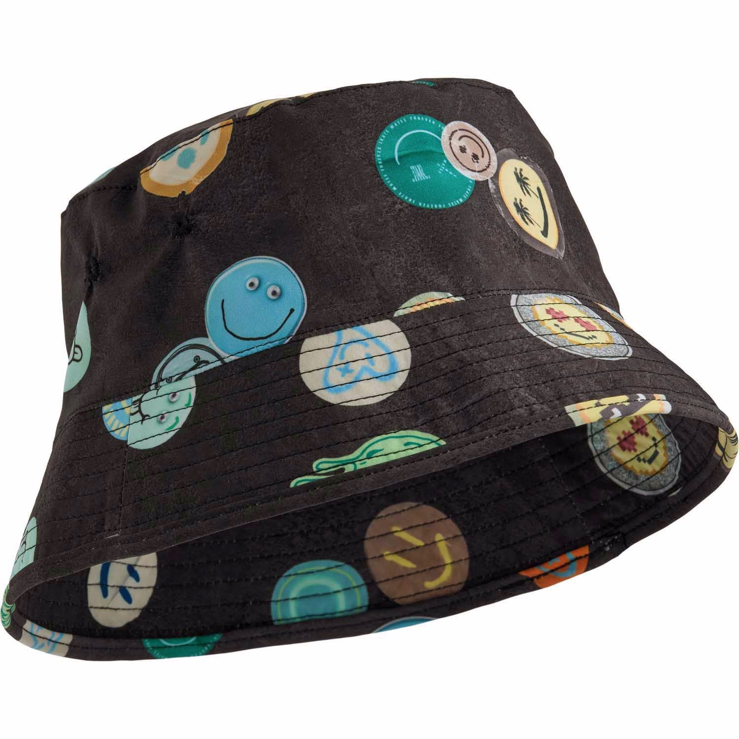Bucket hat in recycled nylon with UV protection 50+. The hat has a regular fit with air holes and is ideal to take to the water, as the material dries quickly. The bucket hat is black with an all-over print of colourful, smiling faces.