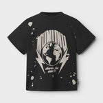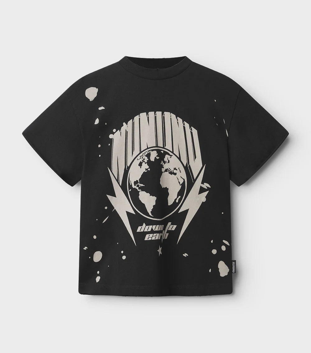 this black t is out of this world, literally. it's a heavy single cotton fit for boys & girls with our new earth print surrounded by a totally rockin take on our nununu logo and some seriously rad lightning bolts to show which kid has all the power. it also says down to earth in our angular print because the world should know this kid totally is. peep the star underneath because that's our thing. to edge it up we’ve added a custom paint splattered look on it along with raw hemlines on the sleeves and on the back hem too. in the front, the hem is totally regular except for our signature touch of custom deconstruction. you know you love it.