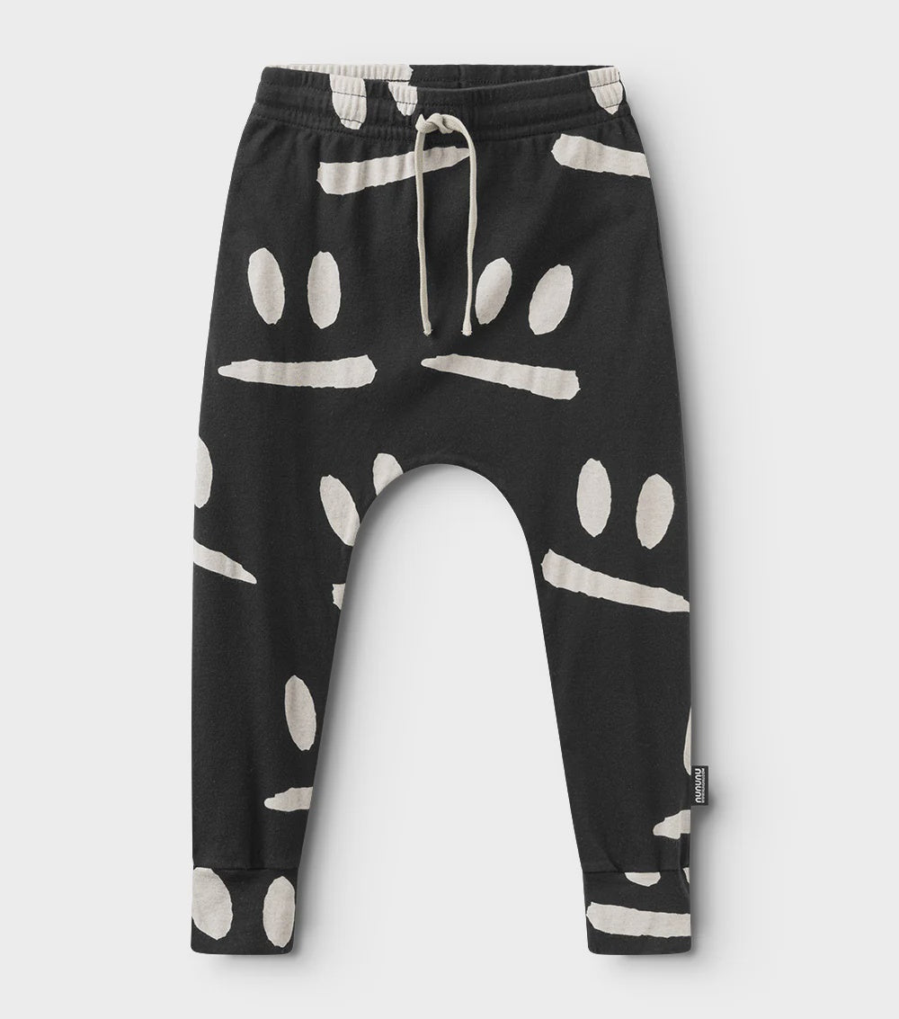 get ready for a full-on smirk-a-thon hosted by the boy or girl that wears these super cool black baggy pants. they’re light & easy to wear with a drawstring waistband, slanted pockets, and a wide lower cuff. the pants are roomy & slouchy, giving legs the freedom they need to run, play & perhaps even sit still at times. the all over smirk print is ideal for kids that are lovers of mischief and want to take their trouble-making game up a couple of notches.
