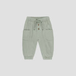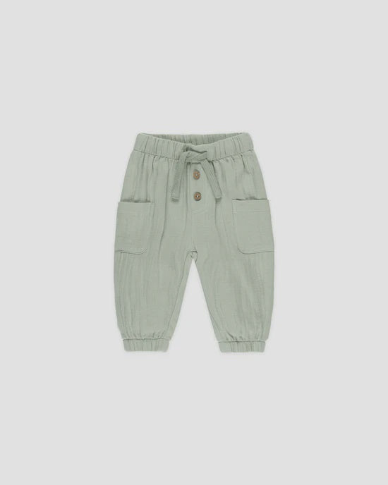 Comfortable woven pants featuring an elastic waistband and leg openings, adjustable drawstring, and side pockets.