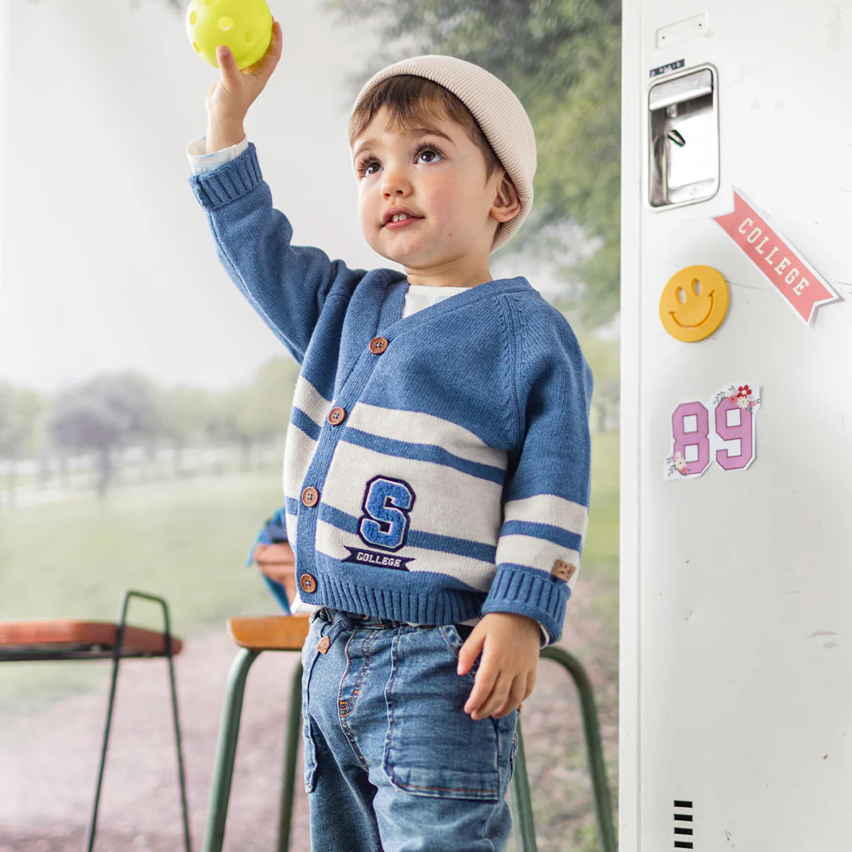 Blue knit cardigan with wide stripes. Features a V-neck and faux wood buttons, along with an embroidered "S" and the word "college" for the perfect academic look. The collar, hem, and cuffs are rib-knit for a better fit. Regular fit V-neck Faux wood buttons Embroidery details Rib-knit collar, hem, and cuffs