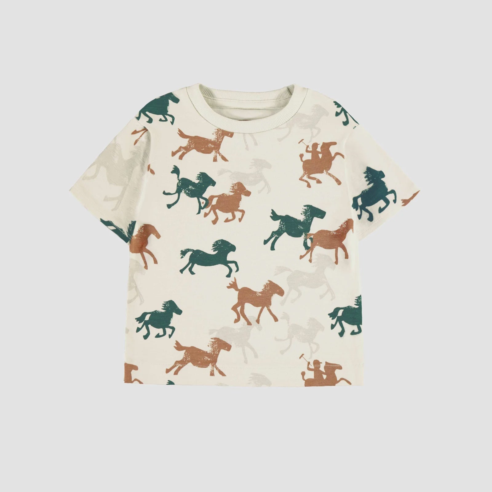 Here's a cream t-shirt with an all over print of horses and polo players on their frames in shades of caramel, turquoise and gray-beige, made in comfortable stretch cotton jersey, modernized with a subtle texture of irregular textured jersey.