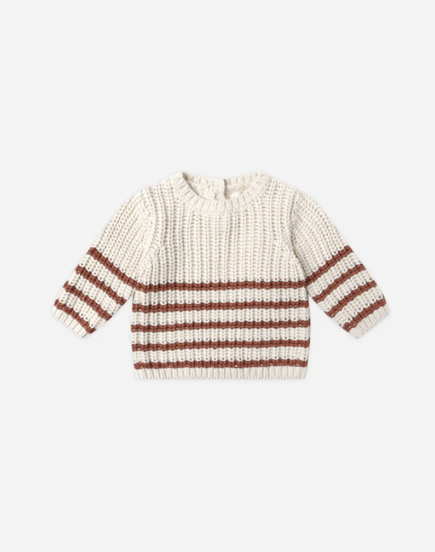 Cozy and chunky, our Rex Sweater features ribbing at the neck, cuffs, and hem, plus a back button placket for easy changing.