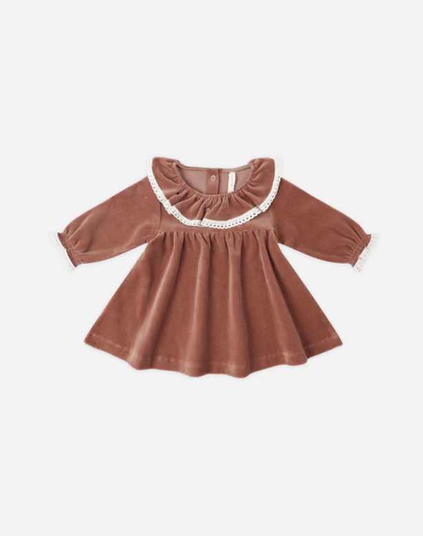 Our Velour Baby Dress features an empire waist dress with long sleeves and a cute ruffled collar.