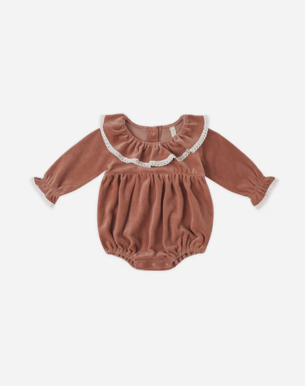 Long sleeve velour romper with gathered waist, ruffle collar, and lace trim details at neckline and cuffs. Snap closures along the inseam for easy changing.