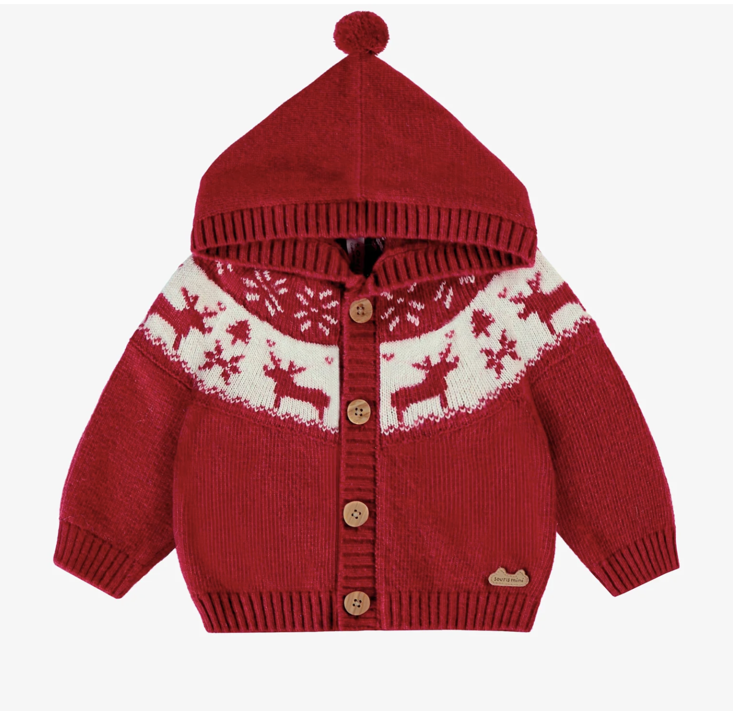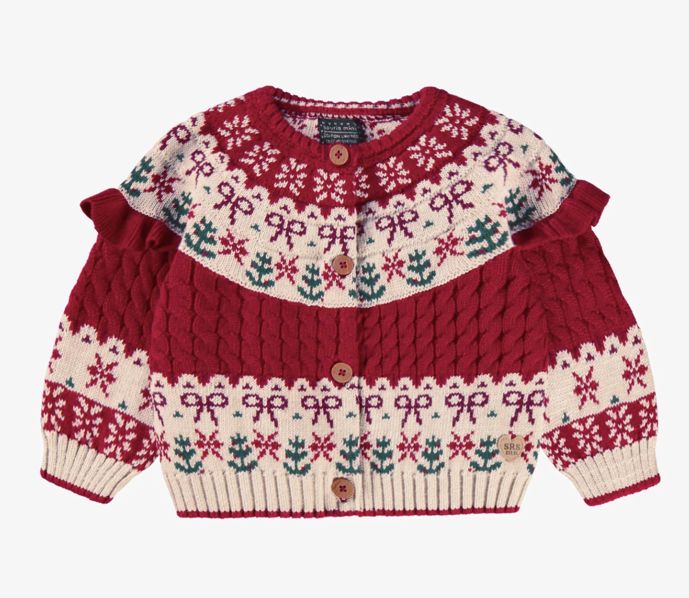Souris Mini - Red knit cardigan with jacquard patterns, baby