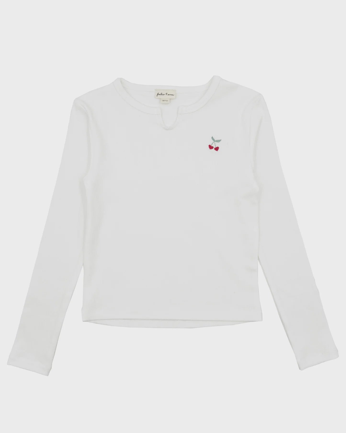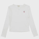 An ode to the 90's, this long sleeve top is featured in a soft rib knit and a slim fit making it perfect for layering or wearing on its own. The split neck and cherry embroidery detail give it the right amount of sweetness and style. Wear it with jeans, joggers, or under our new  overalls.