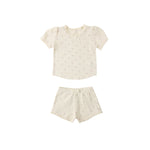 Designed with a delicate bow, crochet lace ruffle detail, and gathered puff sleeves, our Ruby Set is the sweetest look for lounge or play.