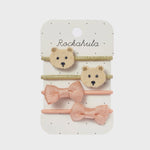 The sweetest fluffy little bears adorn this set of four ponies. Featuring two super soft teddy bear faces on gold elastics, and two shimmering pink linen bows set on sweet pink elastics!