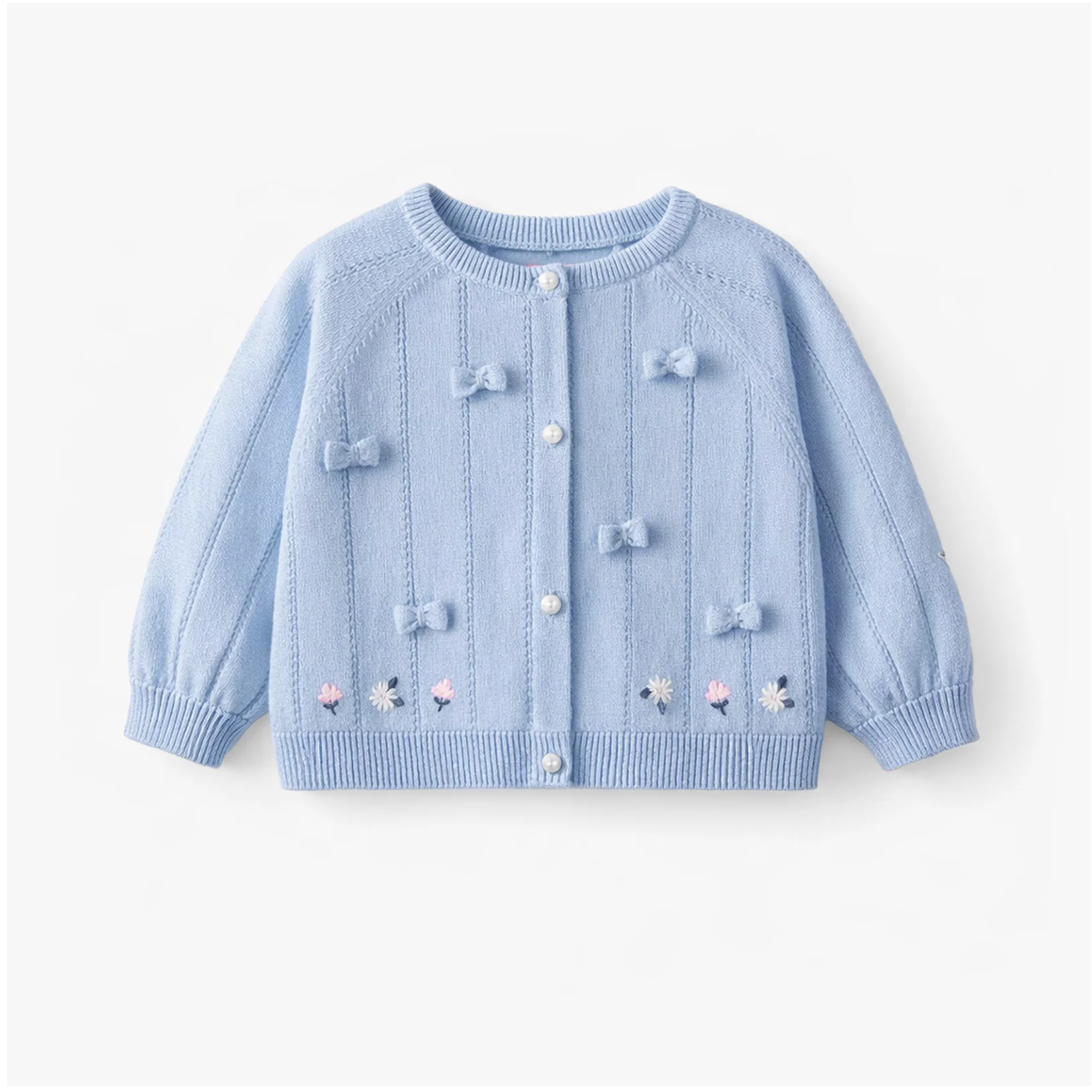 Blue knit cardigan with small loops and embroidered flowers for a fully feminine look. Features pointelle detailing, pearl buttons, long sleeves, and a round neckline. The collar, cuffs, and hem are ribbed for a better