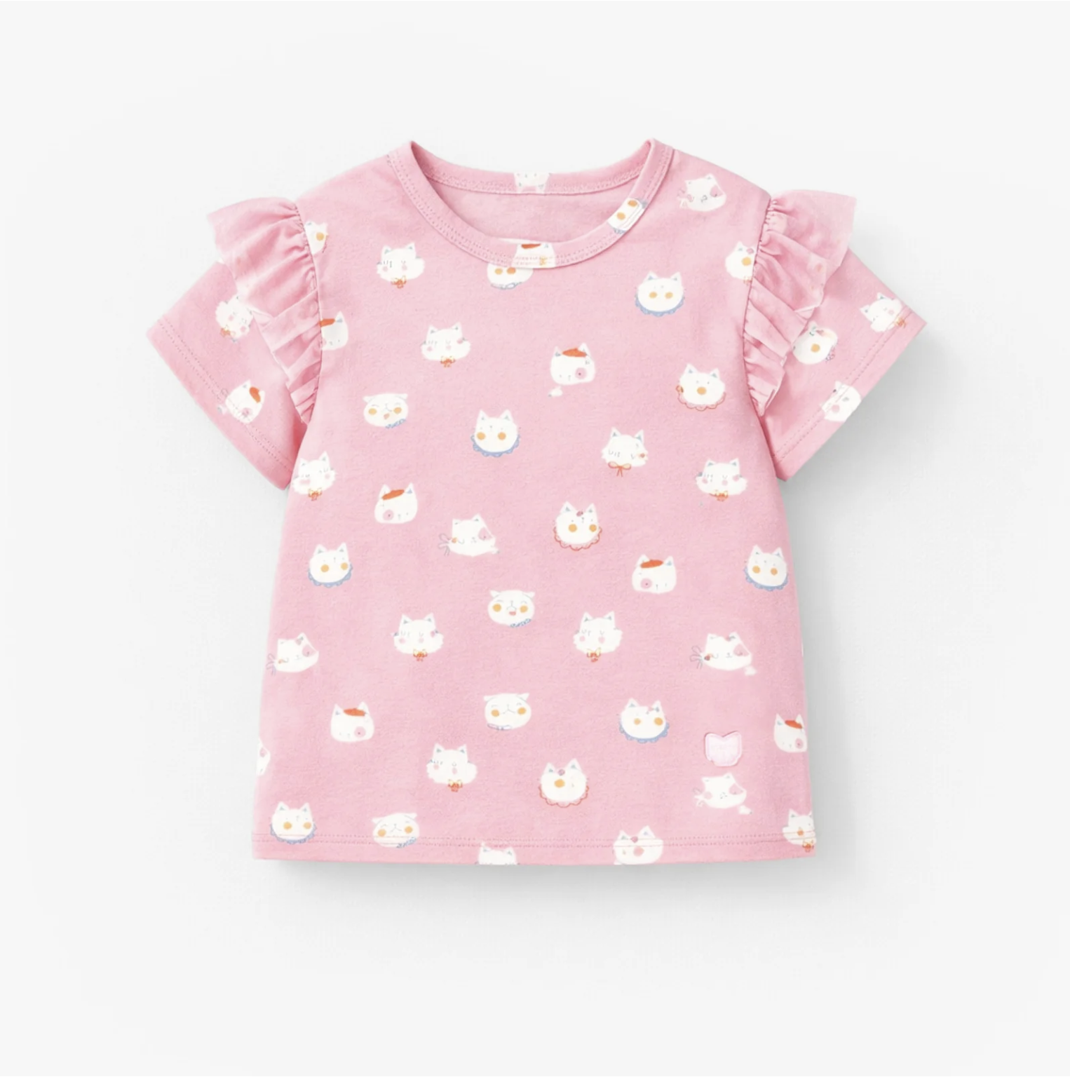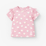 Pink T-shirt with adorable cat prints and soft mesh ruffles on the sleeves for a fully feminine look. Made of stretchy cotton jersey in a fitted cut.