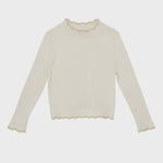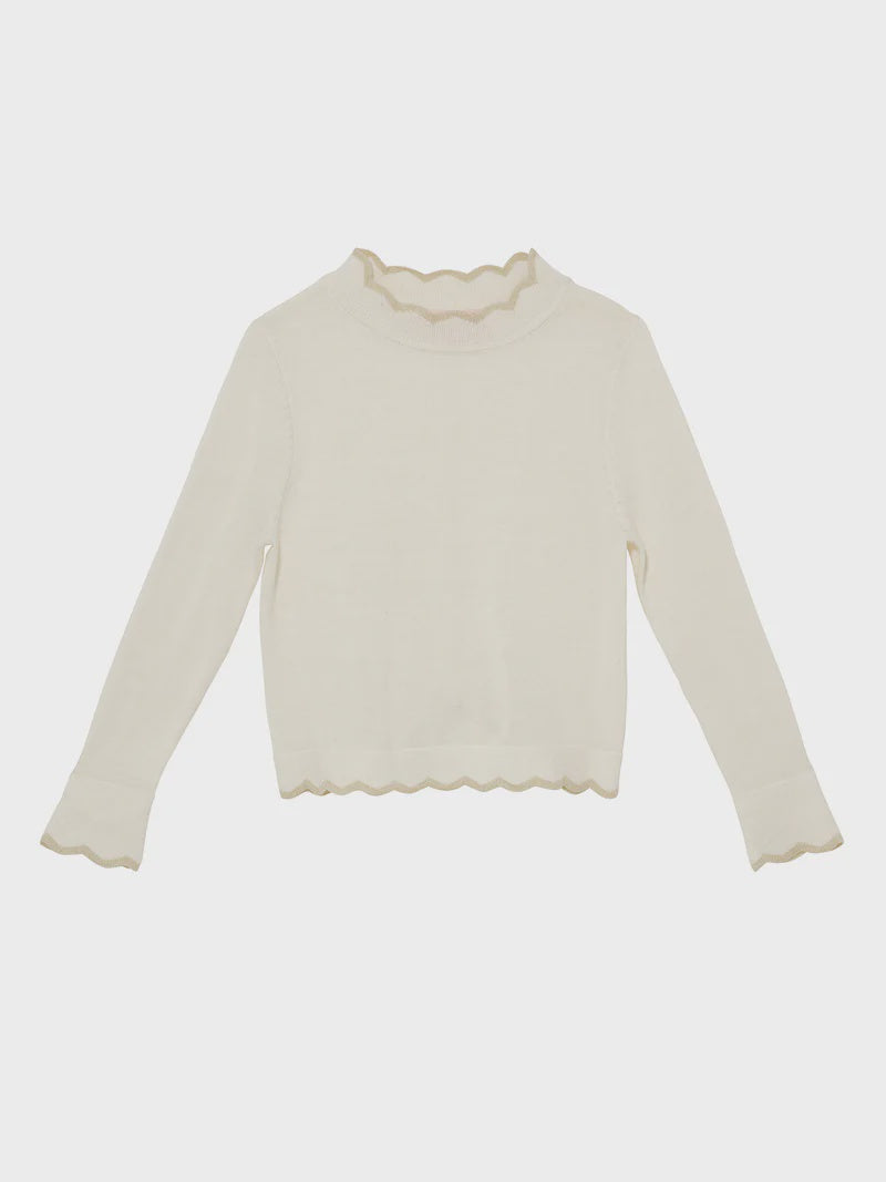 The Skyway top in Ecru is a winter wardrobe staple. The classic top features a scalloped edge with a touch or lurex for extra sparkle, combining style and comfort for your little one.