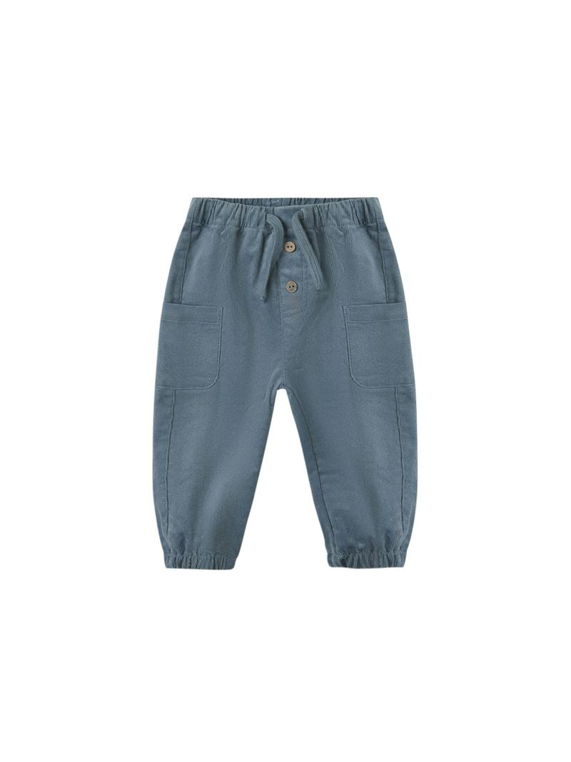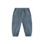 Comfortable woven pants with an elastic waistband and leg openings, adjustable drawstring, and side patch pockets.