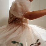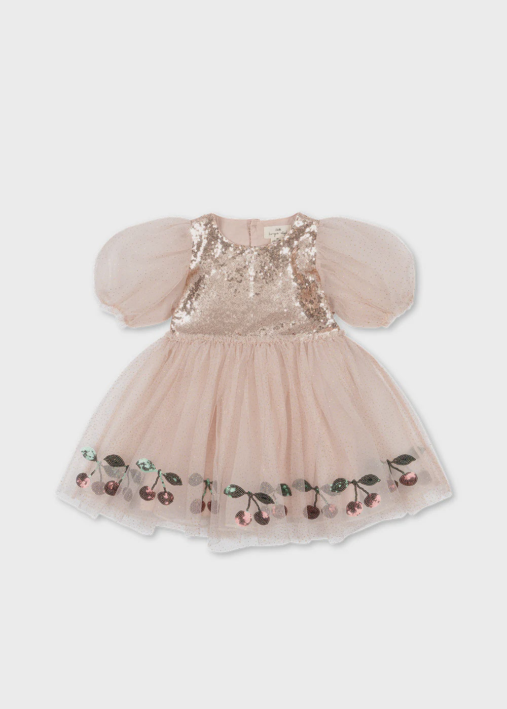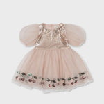 Puff sleeve dress with a sparkly sequin bodice and layered tulle skirt. A festive favorite that fits all occassions. Button closure in the back.