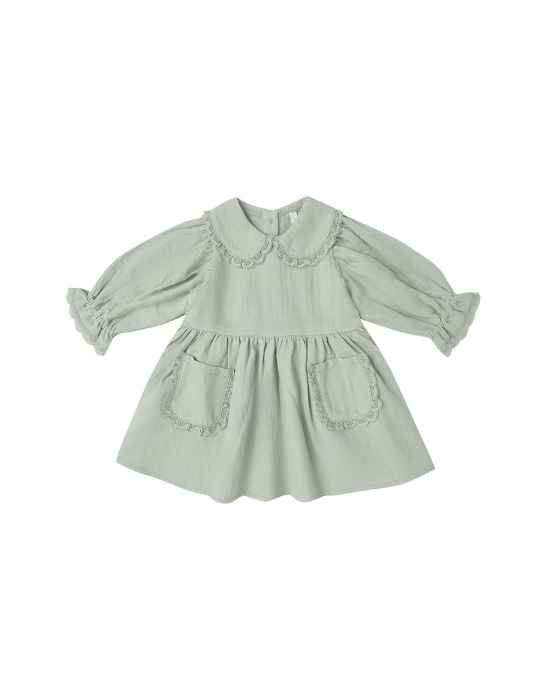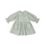 Our Marisol Dress features a Peter Pan collar, patch pockets, and full gathered sleeves—all adorned with delicate lace ruffle trim—and coconut buttons at the back for easy dressing. Coordinating bloomers included with all sizes.