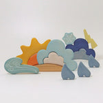We want to make an abstract topic comprehensible to children in a hands-on way. The beautiful shape and feel of the play pieces stimulates the child's imagination and stories about the weather can be experienced and emulated: Let's comfort Little Rabbit who has hidden under his bed out of fear of the thunderstorm! Through play fears can be processed and alleviated. In form and shape, The Weather Building Set is perfectly matched to our Large Twelve-Piece Rainbows. All young builders, of both small and large worlds, can use these pieces to bring sunshine to their day, to conjure up lightning and thunder, or let snow and rain fall from the sky. A good storm drives all the clouds from the sky so that the sun can dry and warm everything once again. Width 5.4 - 21 cm, height 6 - 13.8 cm. Includes 13 pieces.