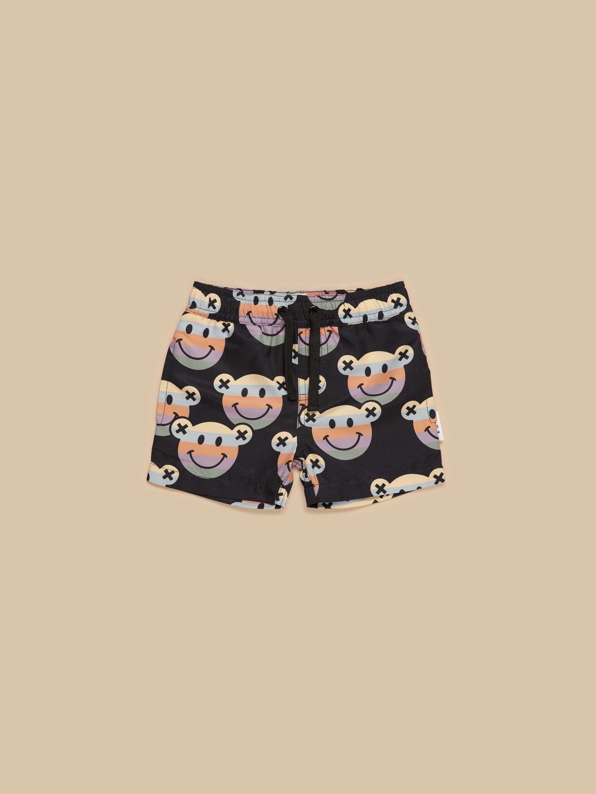 Made from 100% recycled polyester microfibre, these Rainbow Smiley Bear Swim Shorts will put a smile on your dial! Featuring all over smile bear print, front pockets and drawstring tie for an adjustable fit.