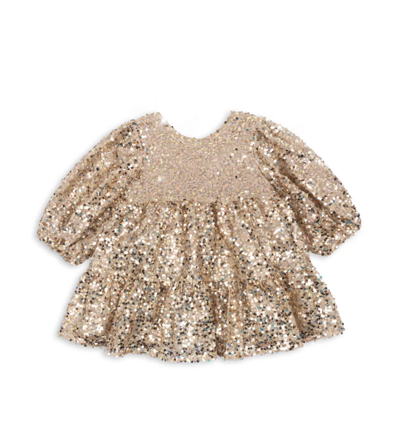 The perfect showstopper: our Lila dress is covered in sparkly sequins and features decorative balloon sleeves and a flared skirt with a soft cotton lining.