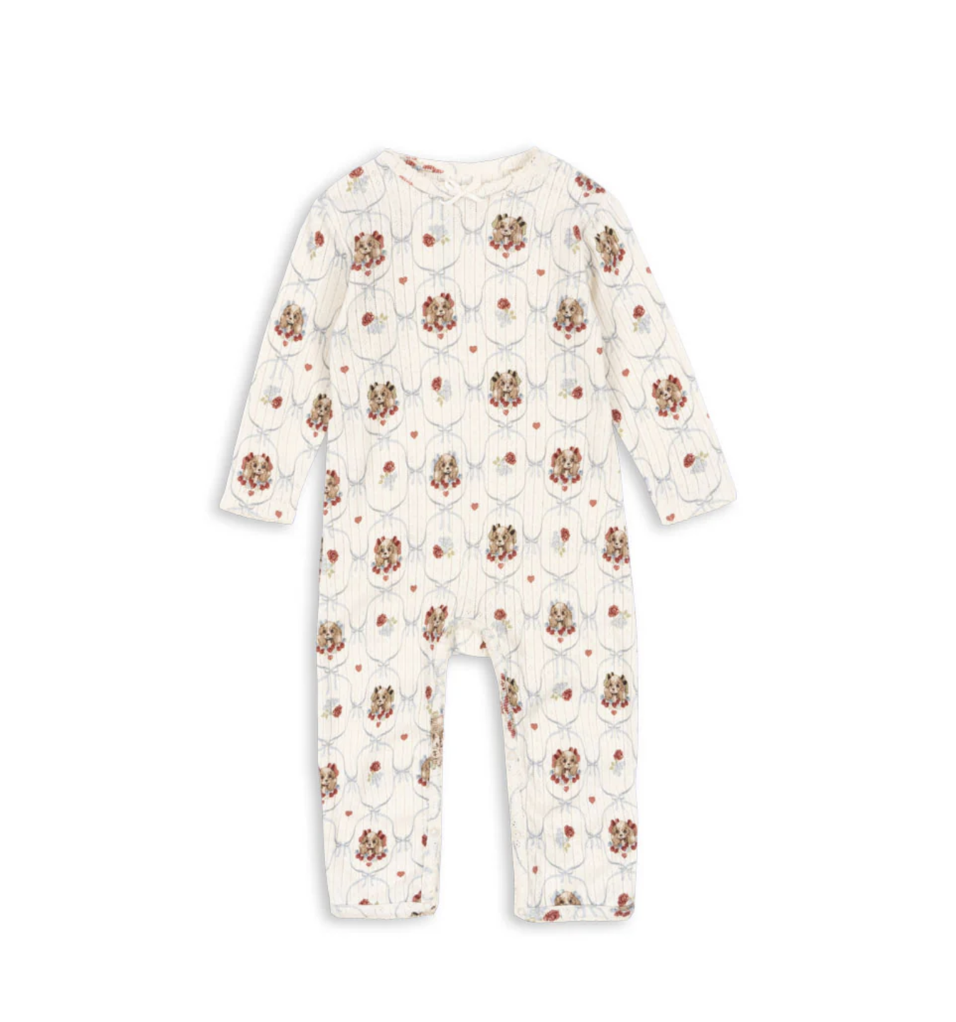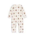 Soft onesie for newborns in a light cotton blend with a hint of stretch. Designed with a wrap closure that features snap buttons along the body and legs for easy dressing.
