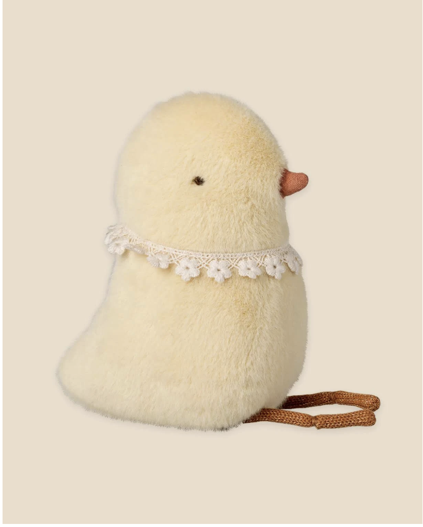 A small plush toy which is perfect for a tiny hand. The mini sized chicken has the sweetest look and a very soft hand feel. The small legs are made of knitted string with golden effect. Metal egg must be bought seperately.