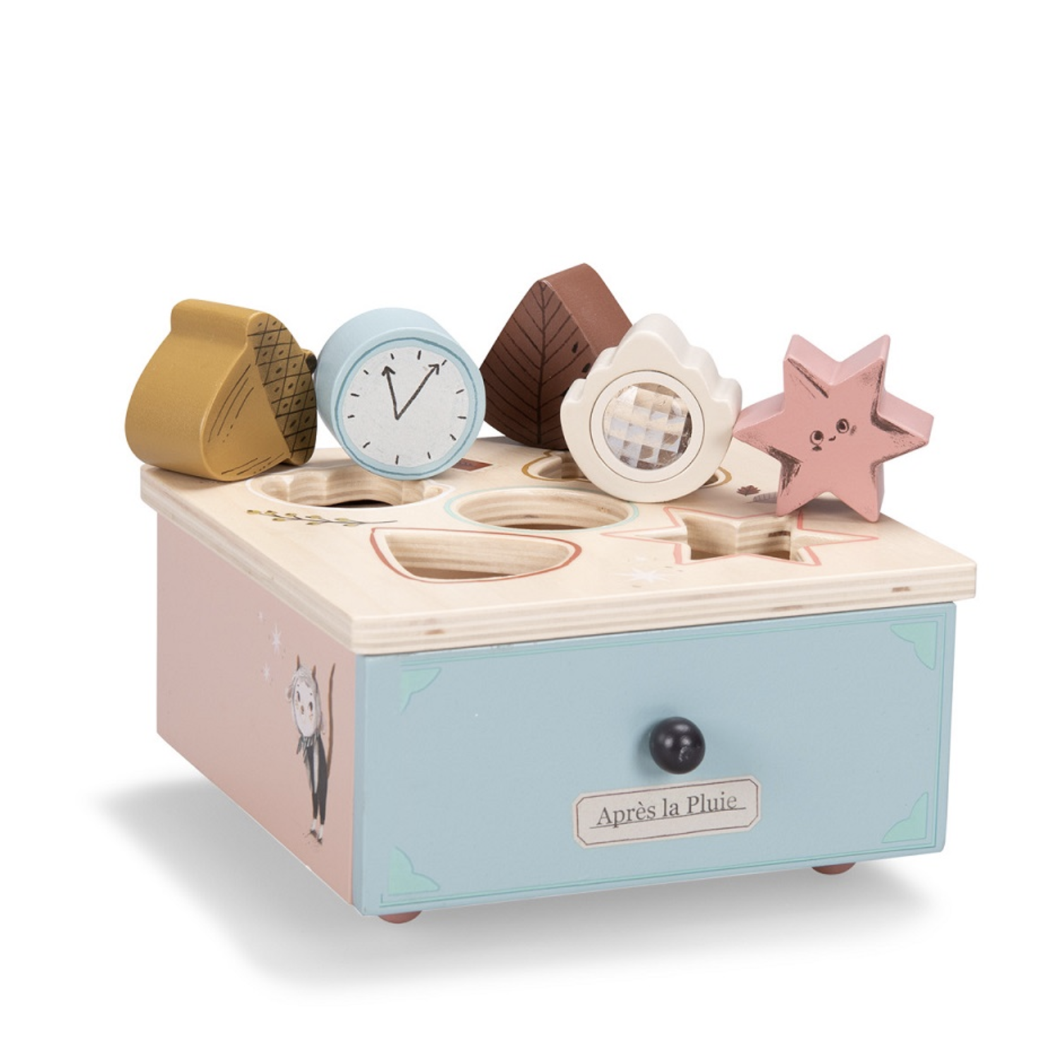 Beautifully illustrated wooden box to help little ones learn about shapes and colours. Contains 5 shapes designed especially to hold in little hands. Each hole is surrounded by the same colour as the matching shape to help baby choose the right one. Measures approximately 16.5 x 8.5 cm. Safety rated for ages 10 months +. To wash with a damp and soft cloth.
