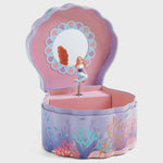 Keep all your precious pearls, seashell collections, jewelry, and more safe in this musical treasure box from Djeco. This clamshell paper covered box has a beautiful undersea illustration with a friendly mermaid. Turn the crank, open the box, and watch as the small mermaid figure comes to life to the music.