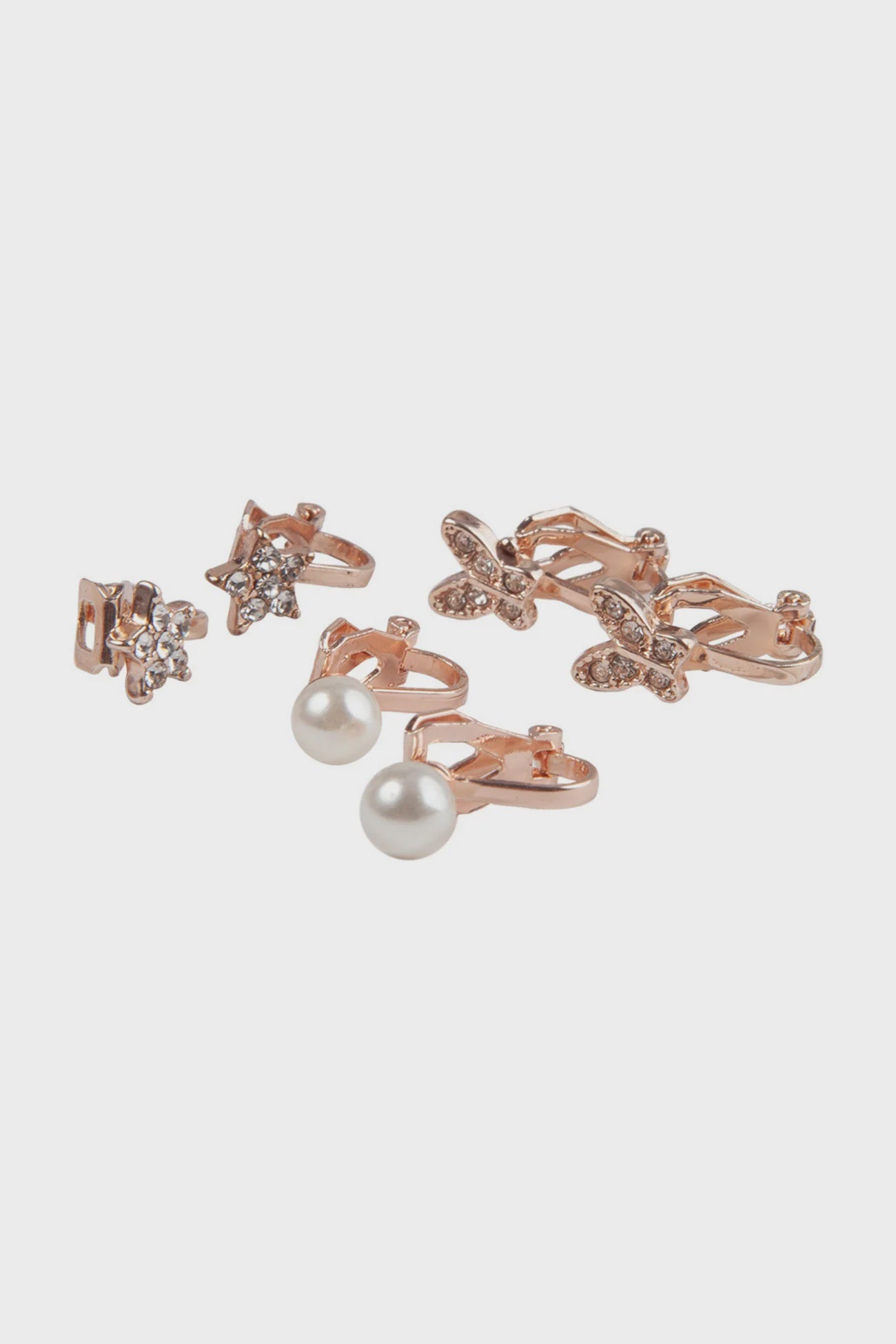 This set of 3 earrings are made for children with unpierced ears! The rose gold-colored clip-on earrings are made in star, butterfly, and pearl designs.