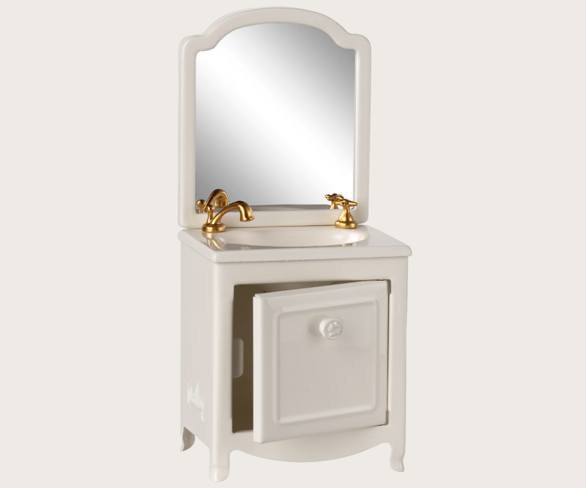 A very essential item for the the bathroom in Mouse hole Farmhouse. It has a small closet under the sink and of course a mirror as well. Add the Maileg toilet and bathtub to extend the play.