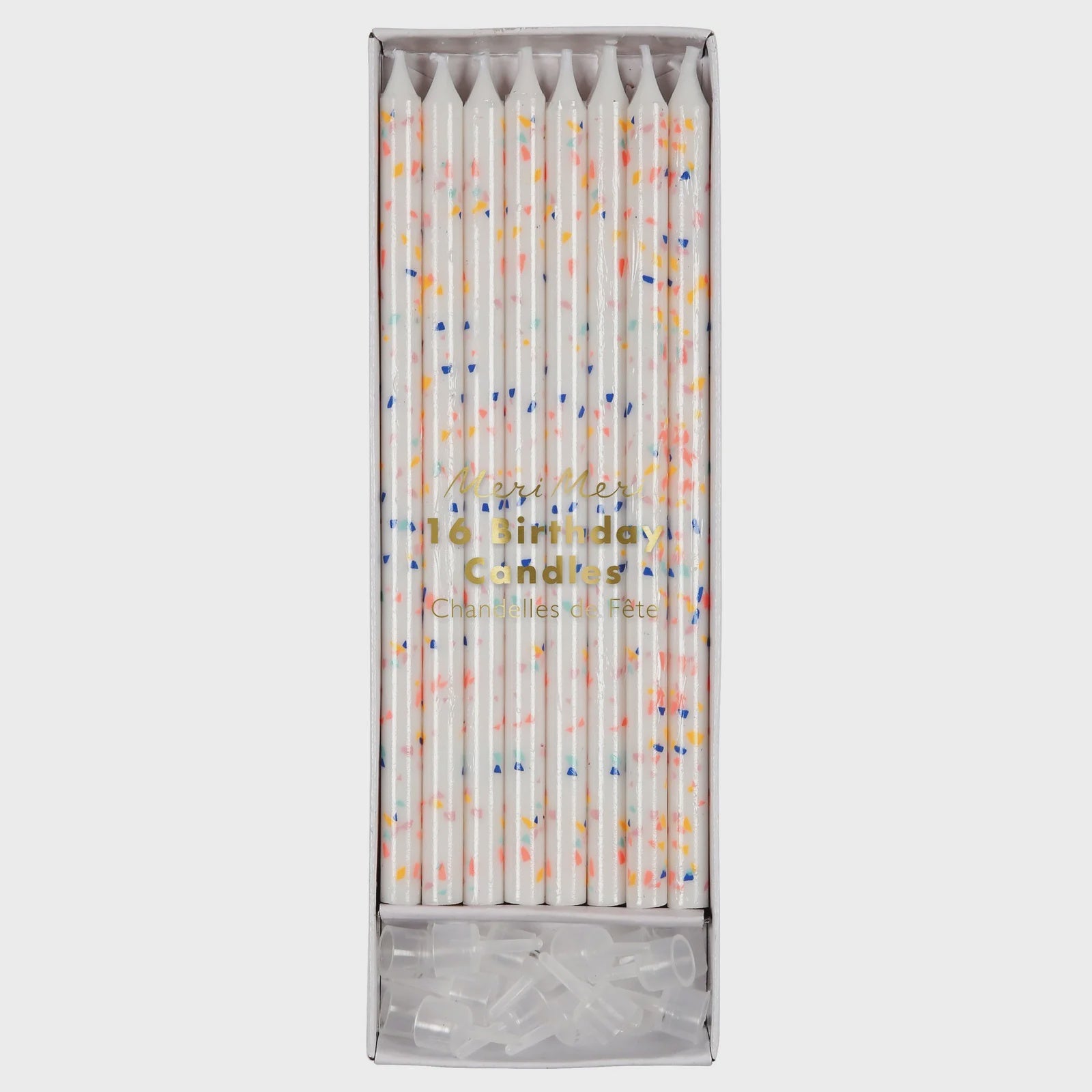 Is it really a celebration at all if no one leans over the cake and blows out the candles? Add a little extra touch of color to your party with this set of 16 tall candles, decorated with multicolored neon flecks.