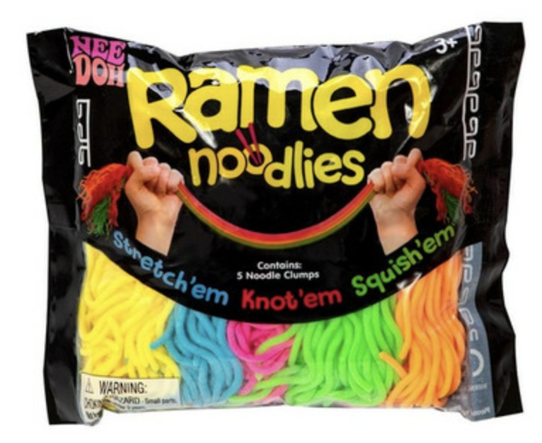 Ramen Noodlies are almost as irresistible as the real thing! You can squeeze, stretch, or mash these crimped textured noodles. Ramen Noodlies are brightly colored in 5 fluorescent tones and offer a unique sensory play experience that creates loads of endless fun. Toss them around with friends or squeeze a handful when you want to mellow out!  Good for ages 3+.