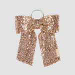 The perfect accessory to add a sparkling touch to any outfit! This glitter hair bow attaches with an elastic, making it ideal for enhancing a bun or ponytail.