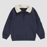 Navy blue sweater with a ¼ zip for a versatile look. Features a kangaroo pocket and cute patches on the front. The ribbed knit hem and cuffs ensure a better fit.