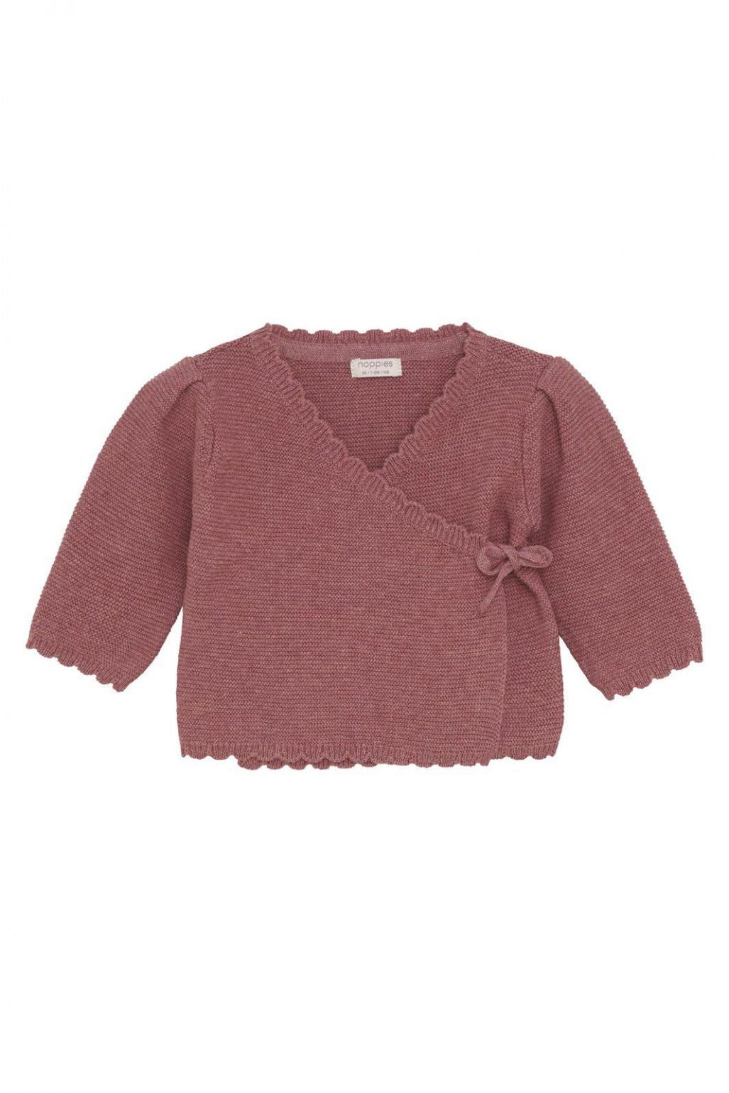 The Girls' Tega Cardigan from Noppies Baby, made with GOTS-certified cotton (CU1392474), is a finely knitted wrap cardigan in heathered pink. It features long sleeves and fastens charmingly with a bow on the side. The wrap design makes dressing and changing easier and more comfortable for your little one since the garment doesn't need to go over their head. This is especially more pleasant for the tiniest ones. GOTS cotton feels very comfortable, and by choosing it, you're making the best choice for yourself, your child, and the world. From the environmentally friendly way the cotton is produced to the ban on child labor, everything meets high standards.