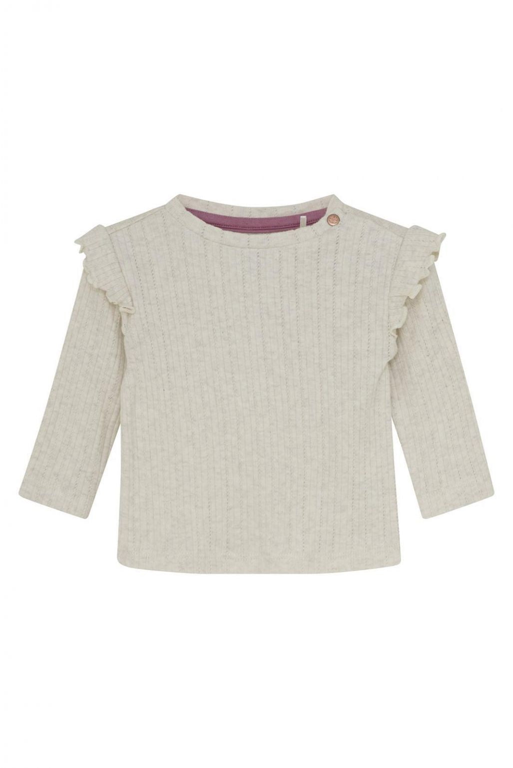 Girls' long sleeve Thornwood from Noppies Baby, made from GOTS-certified cotton (CU1392474), in a pointelle jersey quality. This is a delicate and decorative pattern in the fabric. The long sleeve features a round neckline with a snap button, decorative ruffles on the shoulders, and long sleeves. With GOTS cotton, you're making the best choice for yourself, your child, and the world. From the environmentally conscious way the cotton is produced to the ban on child labor, everything meets high standards. And it’s truly wonderful to wear!