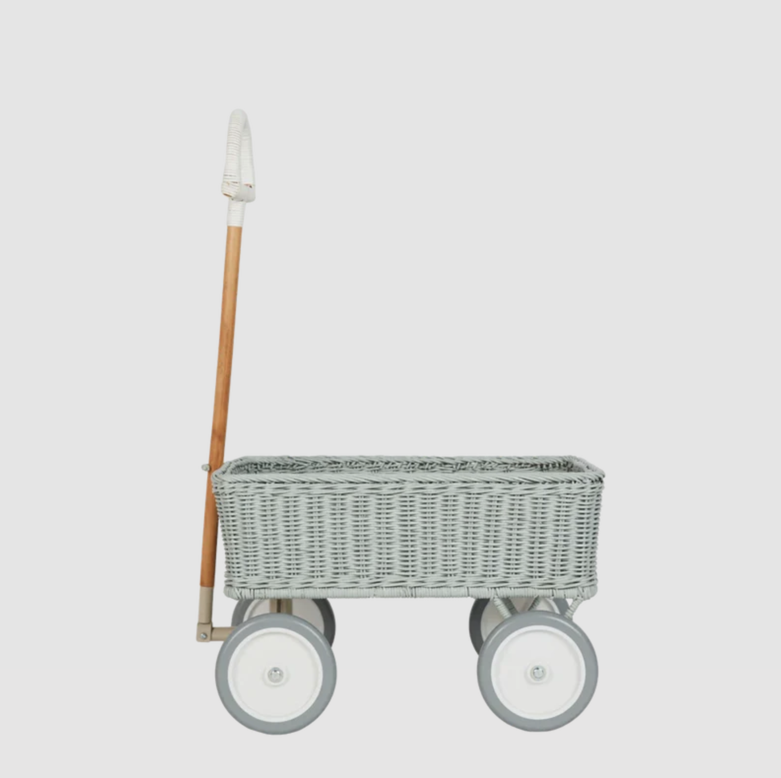 The Wonder Wagon is handmade from natural rattan in Vintage Blue and is built to last. It features a lightweight metal frame for strength and durability, wheels made from recycled plastic, and a bamboo handle so little hands can pull the Wonder Wagon with ease.
