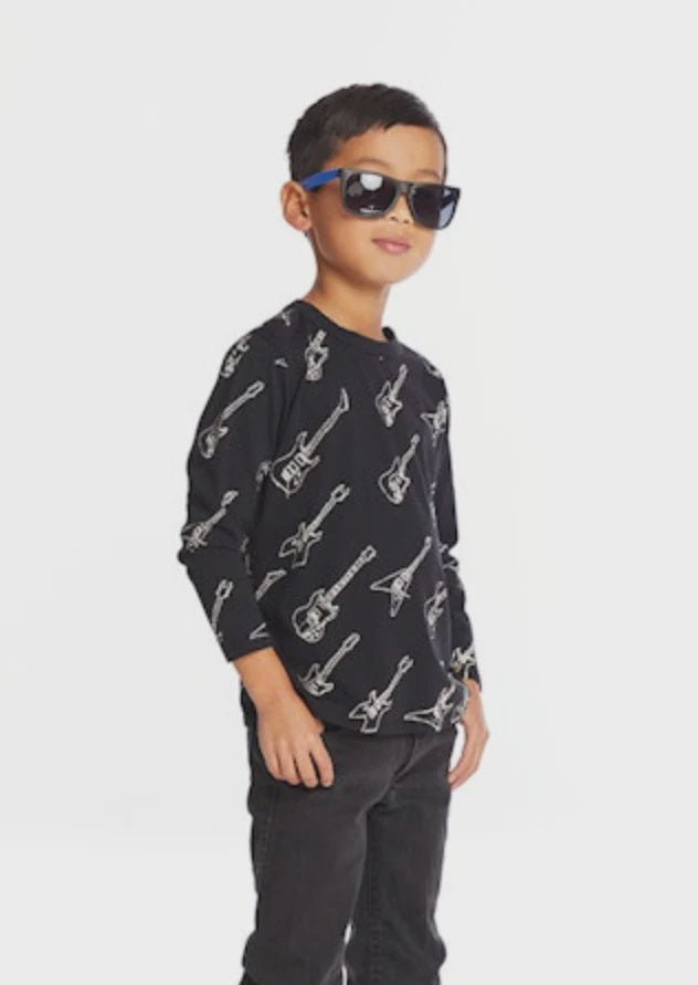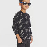Be the next guitar legend with this cool cloud jersey tee. Vibrant white electric guitar patterns pop against a black background. Whether he's strumming or just a super fan, this crew neck long sleeve shows he's all about the music.